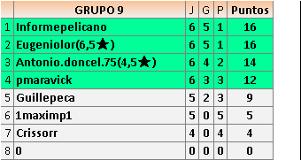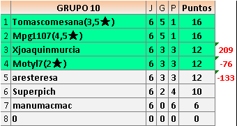 Deja un comentarioEn está página se irán publicando los resultados de las diferentes partidas, siendo ambos jugadores responsables de subirlos o de comprobar que ya hayan sido publicados insertando un COMENTARIO en la parte inferior de la pantalla (opción “Deja tu comentario”), indicando el nombre de los dos jugadores y los puntos obtenidos en la partida.