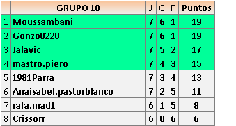 Deja un comentarioEn está página se irán publicando los resultados de las diferentes partidas, siendo ambos jugadores responsables de subirlos o de comprobar que ya hayan sido publicados insertando un COMENTARIO en la parte inferior de la pantalla (opción “Deja tu comentario”), indicando el nombre de los dos jugadores y los puntos obtenidos en la partida.