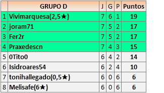 Deja un comentarioEn está página se irán publicando los resultados de las diferentes partidas, siendo ambos jugadores responsables de subirlos o de comprobar que ya hayan sido publicados insertando un COMENTARIO en la parte inferior de la pantalla (opción “Deja tu comentario”), indicando el nombre de los dos jugadores y los puntos obtenidos en la partida.