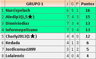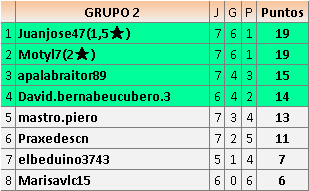 En está página se irán publicando los resultados de las diferentes partidas, siendo ambos jugadores responsables de subirlos o de comprobar que ya hayan sido publicados insertando un COMENTARIO en la parte inferior de la pantalla (opción “Deja tu comentario”), indicando el nombre de los dos jugadores y los puntos obtenidos en la partida.