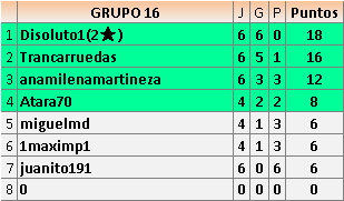 En está página se irán publicando los resultados de las diferentes partidas, siendo ambos jugadores responsables de subirlos o de comprobar que ya hayan sido publicados insertando un COMENTARIO en la parte inferior de la pantalla (opción “Deja tu comentario”), indicando el nombre de los dos jugadores y los puntos obtenidos en la partida.