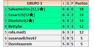Deja un comentarioEn está página se irán publicando los resultados de las diferentes partidas, siendo ambos jugadores responsables de subirlos o de comprobar que ya hayan sido publicados insertando un COMENTARIO en la parte inferior de la pantalla (opción “Deja tu comentario”), indicando el nombre de los dos jugadores y los puntos obtenidos en la partida.