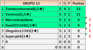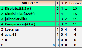 Deja un comentarioEn está página se irán publicando los resultados de las diferentes partidas, siendo ambos jugadores responsables de subirlos o de comprobar que ya hayan sido publicados insertando un COMENTARIO en la parte inferior de la pantalla (opción “Deja tu comentario”), indicando el nombre de los dos jugadores y los puntos obtenidos en la partida.