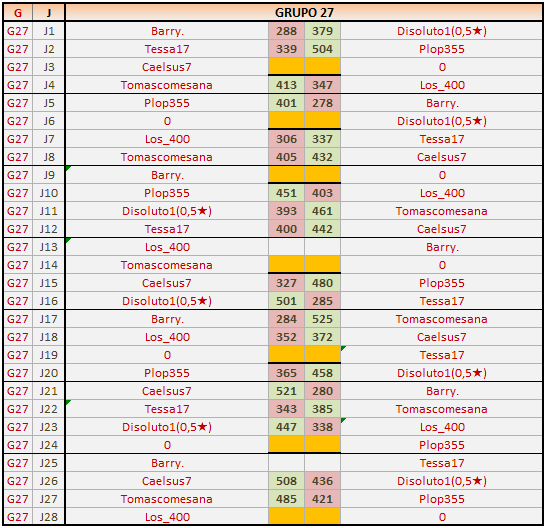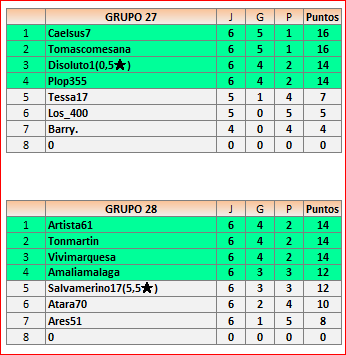 Deja un comentarioEn está página se irán publicando los resultados de las diferentes partidas, siendo ambos jugadores responsables de subirlos o de comprobar que ya hayan sido publicados, insertando un COMENTARIO en la parte inferior de la pantalla (opción “Deja tu comentario”), indicando el nombre de los dos jugadores y los puntos obtenidos en la partida.