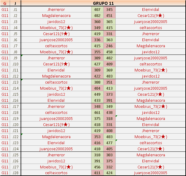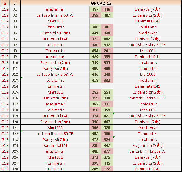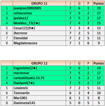 Hola!. Acabo de ver los resultados del grupo 12, y os comento porque creo hay algún error, ya que el primero del grupo tiene mas puntos que el segundo habiendo ganado el segundo una partida mas. Si estoy equivocada pues, disculpadme, que solo falta que os de mas trabajo del que ya haceis.