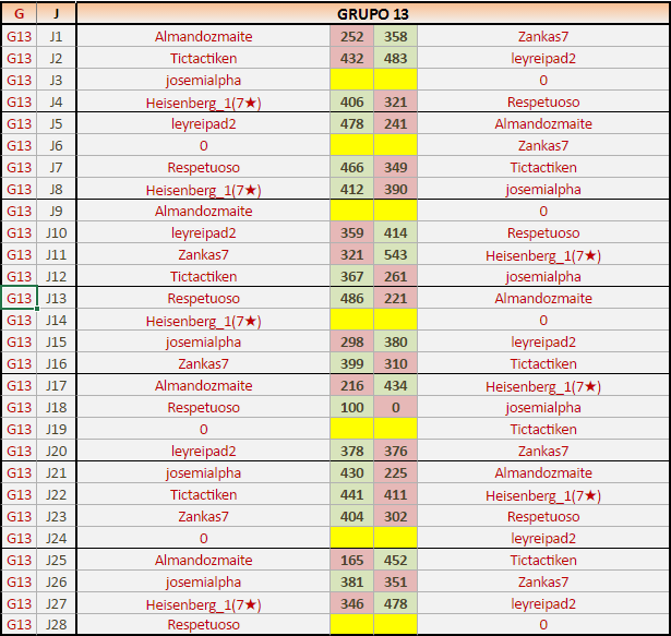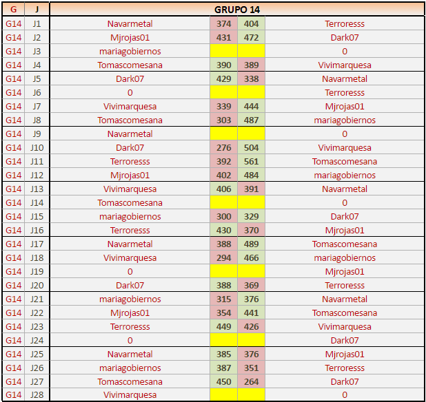 Deja un comentarioEn está página se irán publicando los resultados de las diferentes partidas, siendo ambos jugadores responsables de subirlos o de comprobar que ya hayan sido publicados, insertando un COMENTARIO en la parte inferior de la pantalla (opción “Deja tu comentario”), indicando el nombre de los dos jugadores y los puntos obtenidos en la partida.