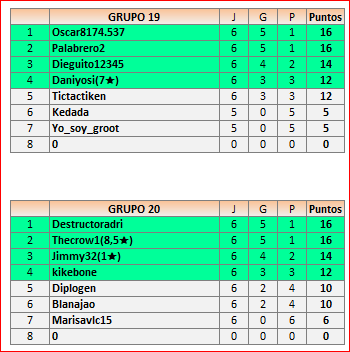 Deja un comentarioEn está página se irán publicando los resultados de las diferentes partidas, siendo ambos jugadores responsables de subirlos o de comprobar que ya hayan sido publicados, insertando un COMENTARIO en la parte inferior de la pantalla (opción “Deja tu comentario”), indicando el nombre de los dos jugadores y los puntos obtenidos en la partida.