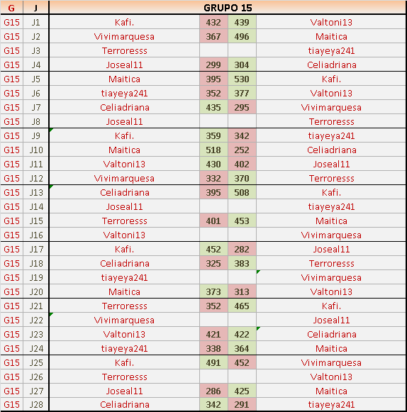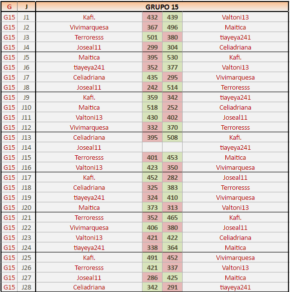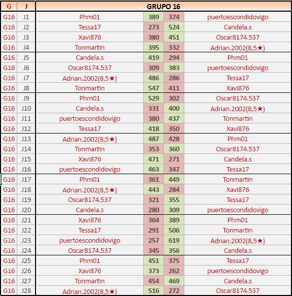 Deja un comentarioEn está página se irán publicando los resultados de las diferentes partidas, siendo ambos jugadores responsables de subirlos o de comprobar que ya hayan sido publicados, insertando un COMENTARIO en la parte inferior de la pantalla (opción “Deja tu comentario”), indicando el nombre de los dos jugadores y los puntos obtenidos en la partida.