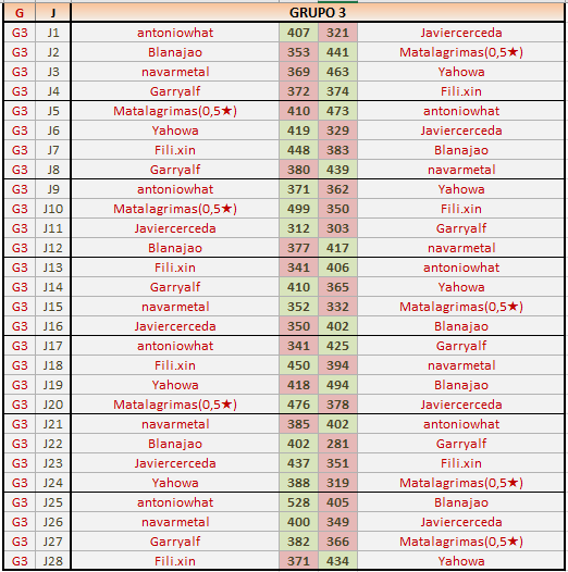 Deja un comentarioEn está página se irán publicando los resultados de las diferentes partidas, siendo ambos jugadores responsables de subirlos o de comprobar que ya hayan sido publicados, insertando un COMENTARIO en la parte inferior de la pantalla (opción “Deja tu comentario”), indicando el nombre de los dos jugadores y los puntos obtenidos en la partida.