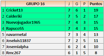 Deja un comentarioEn está página se irán publicando los resultados de las diferentes partidas, siendo ambos jugadores responsables de subirlos o de comprobar que ya hayan sido publicados, insertando un COMENTARIO en la parte inferior de la pantalla (opción “Deja tu comentario”), indicando el nombre de los dos jugadores y los puntos obtenidos en la partida.