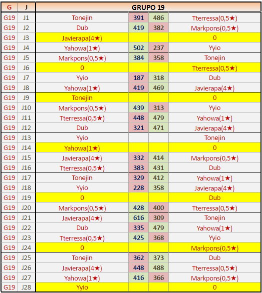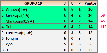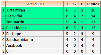 Deja un comentarioEn está página se irán publicando los resultados de las diferentes partidas, siendo ambos jugadores responsables de subirlos o de comprobar que ya hayan sido publicados, insertando un COMENTARIO en la parte inferior de la pantalla (opción “Deja tu comentario”), indicando el nombre de los dos jugadores y los puntos obtenidos en la partida.