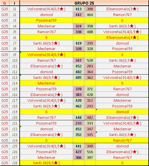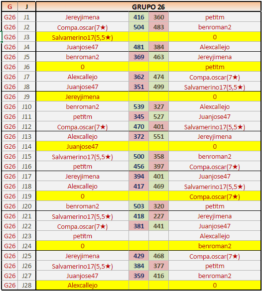 Deja un comentarioEn está página se irán publicando los resultados de las diferentes partidas, siendo ambos jugadores responsables de subirlos o de comprobar que ya hayan sido publicados, insertando un COMENTARIO en la parte inferior de la pantalla (opción “Deja tu comentario”), indicando el nombre de los dos jugadores y los puntos obtenidos en la partida.