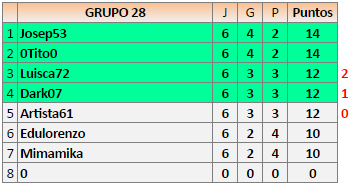 La clasificación está mal y tenéis que rectificarla porque yo y Dark06 estamos clasificados por diferencia de puntos y Luisca72 no.