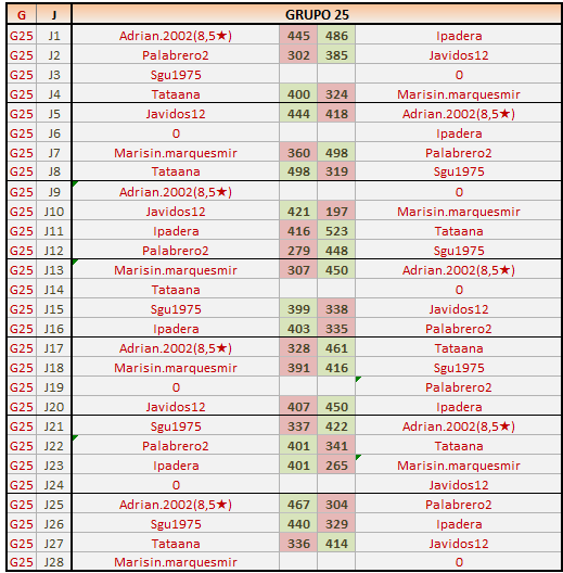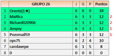 Deja un comentarioEn está página se irán publicando los resultados de las diferentes partidas, siendo ambos jugadores responsables de subirlos o de comprobar que ya hayan sido publicados insertando un COMENTARIO en la parte inferior de la pantalla (opción «Deja tu comentario»), indicando el nombre de los dos jugadores y los puntos obtenidos en la partida.