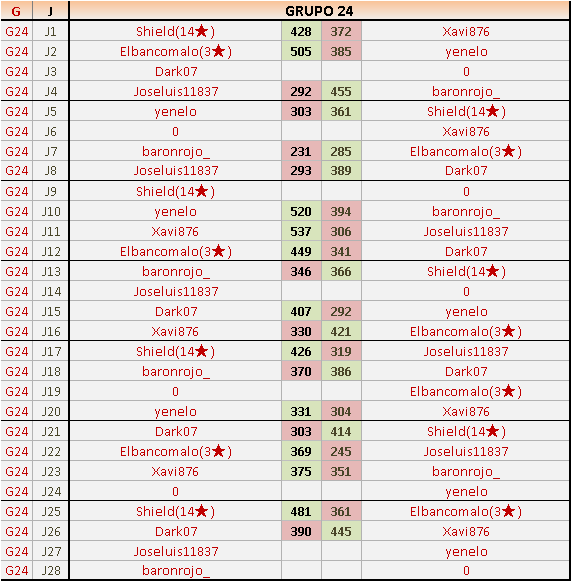 Deja un comentarioEn está página se irán publicando los resultados de las diferentes partidas, siendo ambos jugadores responsables de subirlos o de comprobar que ya hayan sido publicados insertando un COMENTARIO en la parte inferior de la pantalla (opción «Deja tu comentario»), indicando el nombre de los dos jugadores y los puntos obtenidos en la partida.