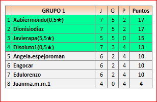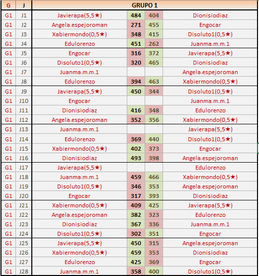 Deja un comentarioEn está página se irán publicando los resultados de las diferentes partidas, siendo ambos jugadores responsables de subirlos o de comprobar que ya hayan sido publicados insertando un COMENTARIO en la parte inferior de la pantalla (opción “Deja tu comentario”), indicando el nombre de los dos jugadores y los puntos obtenidos en la partida.