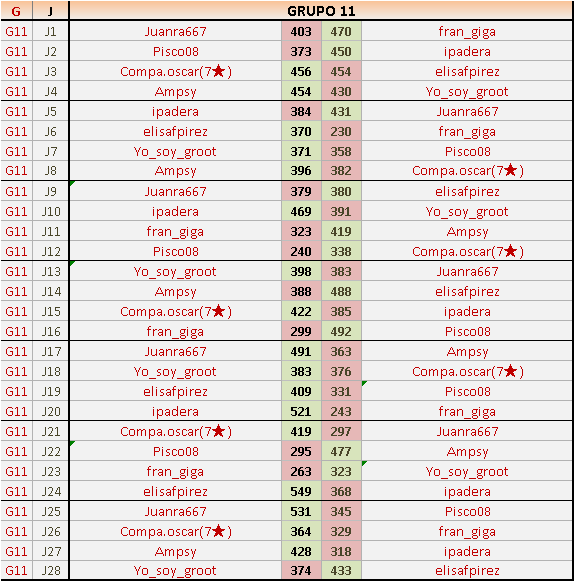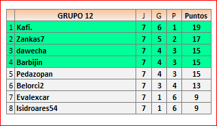 Deja un comentarioEn está página se irán publicando los resultados de las diferentes partidas, siendo ambos jugadores responsables de subirlos o de comprobar que ya hayan sido publicados insertando un COMENTARIO en la parte inferior de la pantalla (opción “Deja tu comentario”), indicando el nombre de los dos jugadores y los puntos obtenidos en la partida.