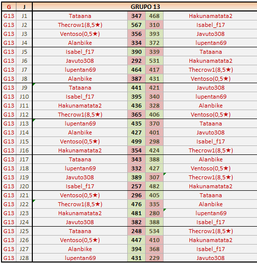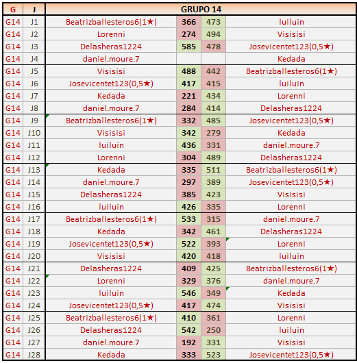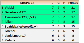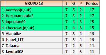 Deja un comentarioEn está página se irán publicando los resultados de las diferentes partidas, siendo ambos jugadores responsables de subirlos o de comprobar que ya hayan sido publicados insertando un COMENTARIO en la parte inferior de la pantalla (opción “Deja tu comentario”), indicando el nombre de los dos jugadores y los puntos obtenidos en la partida.
