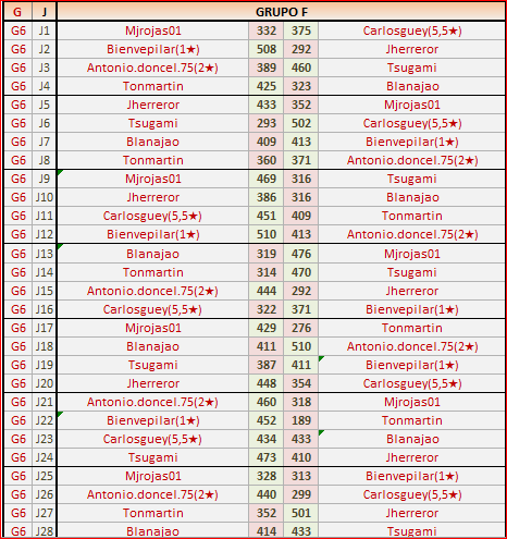 Deja un comentarioES OBLIGATORIO RESPETAR EL ORDEN LOCAL (IZQ) Y VISITANTE (DER), ASÍ COMO INDICAR EL GRUPO CORRESPONDIENTE Y LOS NÚMEROS DE JORNADA.