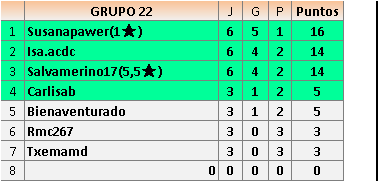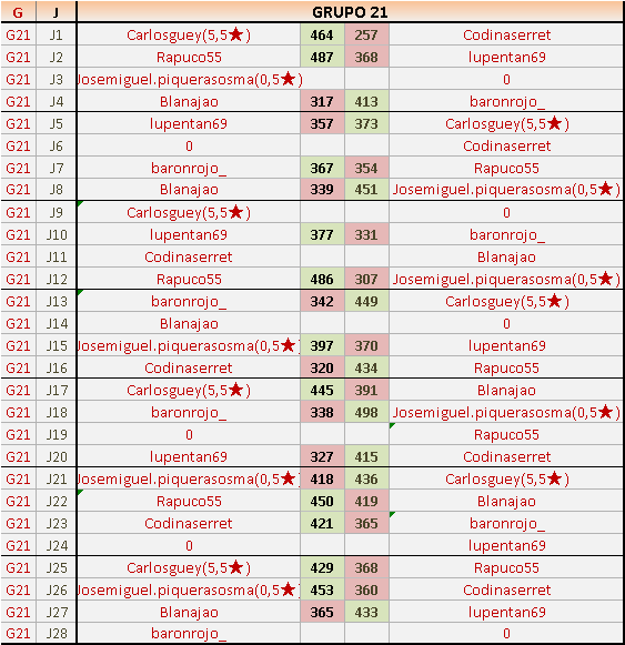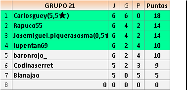 Deja un comentarioEn está página se irán publicando los resultados de las diferentes partidas, siendo ambos jugadores responsables de subirlos o de comprobar que ya hayan sido publicados insertando un COMENTARIO en la parte inferior de la pantalla (opción “Deja tu comentario”), indicando el nombre de los dos jugadores y los puntos obtenidos en la partida.