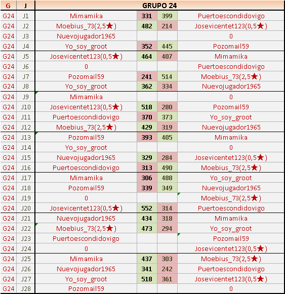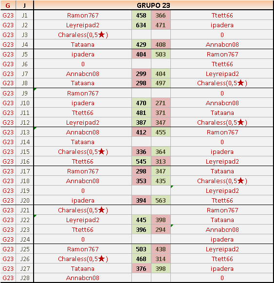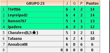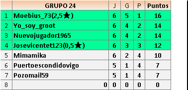 Deja un comentarioEn está página se irán publicando los resultados de las diferentes partidas, siendo ambos jugadores responsables de subirlos o de comprobar que ya hayan sido publicados insertando un COMENTARIO en la parte inferior de la pantalla (opción “Deja tu comentario”), indicando el nombre de los dos jugadores y los puntos obtenidos en la partida.