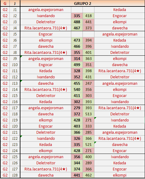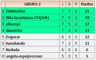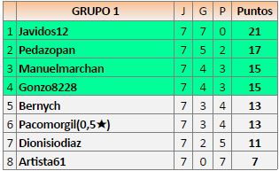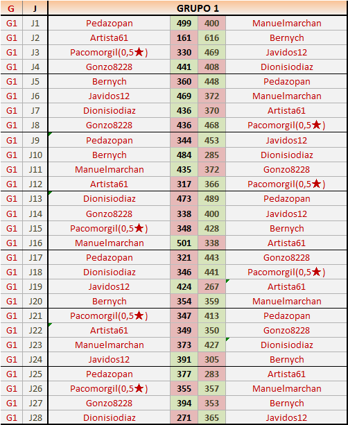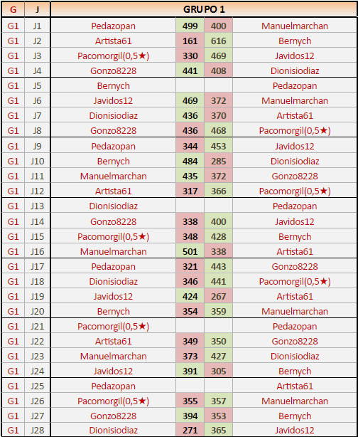 Deja un comentarioEn está página se irán publicando los resultados de las diferentes partidas, siendo ambos jugadores responsables de subirlos o de comprobar que ya hayan sido publicados insertando un COMENTARIO en la parte inferior de la pantalla (opción “Deja tu comentario”), indicando el nombre de los dos jugadores y los puntos obtenidos en la partida.