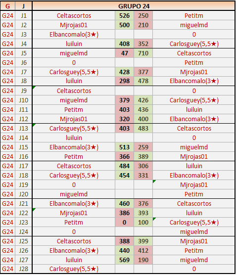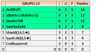Deja un comentarioEn está página se irán publicando los resultados de las diferentes partidas, siendo ambos jugadores responsables de subirlos o de comprobar que ya hayan sido publicados insertando un COMENTARIO en la parte inferior de la pantalla (opción “Deja tu comentario”), indicando el nombre de los dos jugadores y los puntos obtenidos en la partida.