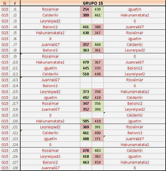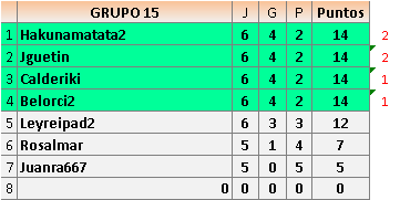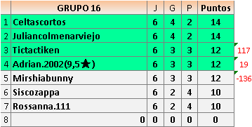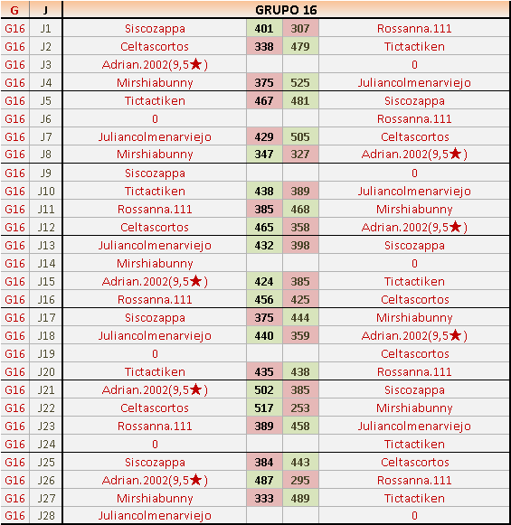Deja un comentarioEn está página se irán publicando los resultados de las diferentes partidas, siendo ambos jugadores responsables de subirlos o de comprobar que ya hayan sido publicados insertando un COMENTARIO en la parte inferior de la pantalla (opción “Deja tu comentario”), indicando el nombre de los dos jugadores y los puntos obtenidos en la partida.