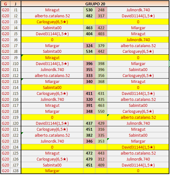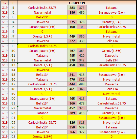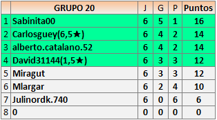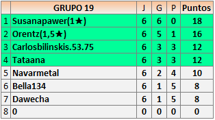 Deja un comentarioEn está página se irán publicando los resultados de las diferentes partidas, siendo ambos jugadores responsables de subirlos o de comprobar que ya hayan sido publicados insertando un COMENTARIO en la parte inferior de la pantalla (opción “Deja tu comentario”), indicando el nombre de los dos jugadores y los puntos obtenidos en la partida.