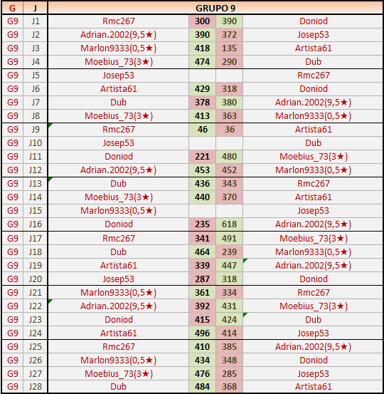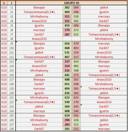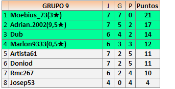 Deja un comentarioEn está página se irán publicando los resultados de las diferentes partidas, siendo ambos jugadores responsables de subirlos o de comprobar que ya hayan sido publicados insertando un COMENTARIO en la parte inferior de la pantalla (opción “Deja tu comentario”), indicando el nombre de los dos jugadores y los puntos obtenidos en la partida.