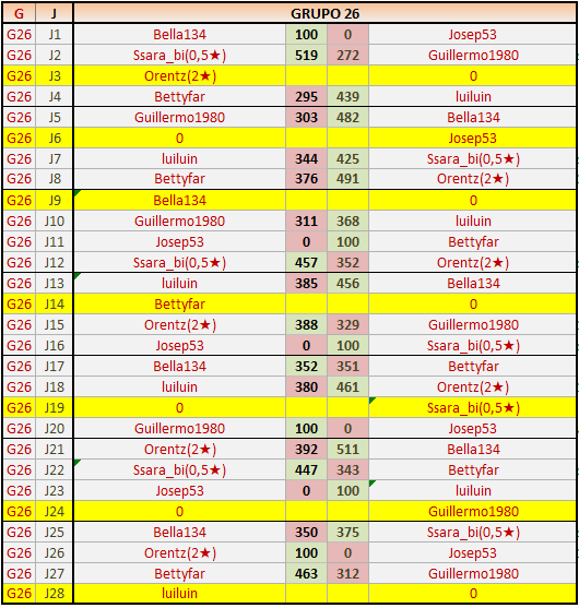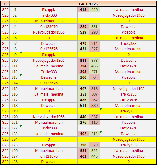 Deja un comentarioEn está página se irán publicando los resultados de las diferentes partidas, siendo ambos jugadores responsables de subirlos o de comprobar que ya hayan sido publicados insertando un COMENTARIO en la parte inferior de la pantalla (opción “Deja tu comentario”), indicando el nombre de los dos jugadores y los puntos obtenidos en la partida.