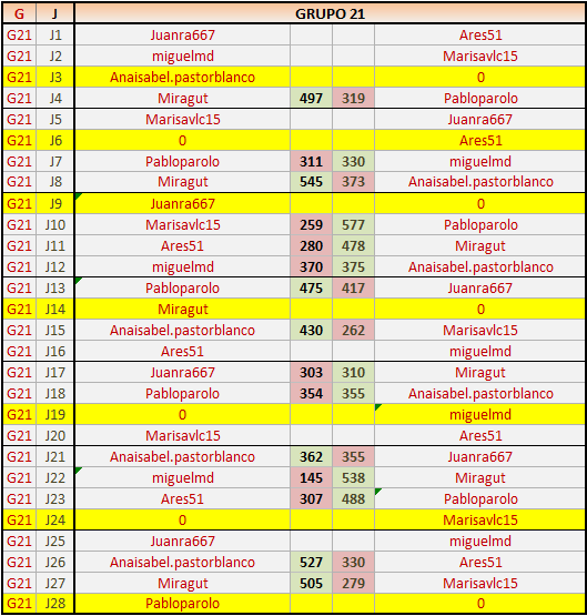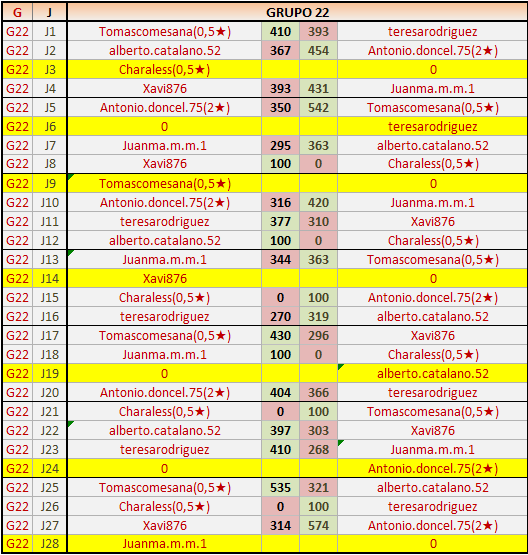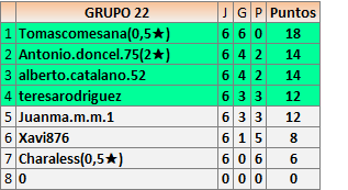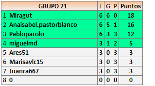 Deja un comentarioEn está página se irán publicando los resultados de las diferentes partidas, siendo ambos jugadores responsables de subirlos o de comprobar que ya hayan sido publicados insertando un COMENTARIO en la parte inferior de la pantalla (opción “Deja tu comentario”), indicando el nombre de los dos jugadores y los puntos obtenidos en la partida.
