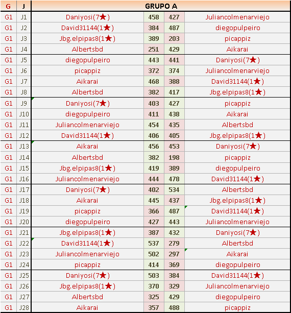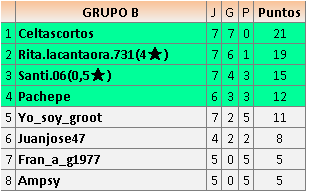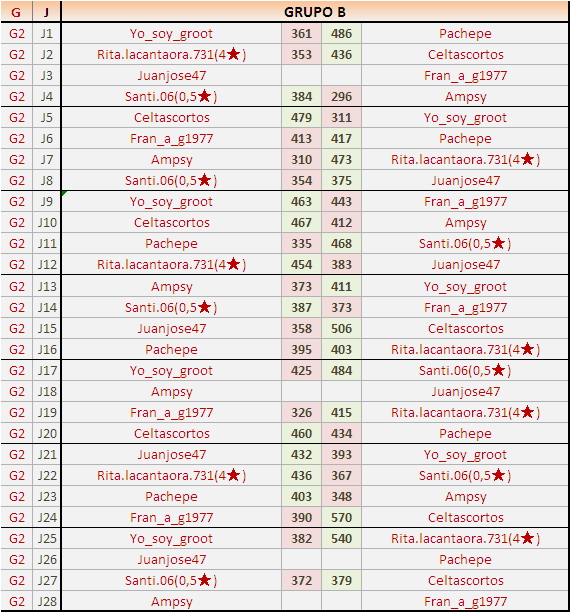 Deja un comentarioEn está página se irán publicando los resultados de las diferentes partidas, siendo ambos jugadores responsables de subirlos o de comprobar que ya hayan sido publicados insertando un COMENTARIO en la parte inferior de la pantalla (opción “Deja tu comentario”), indicando el nombre de los dos jugadores y los puntos obtenidos en la partida.