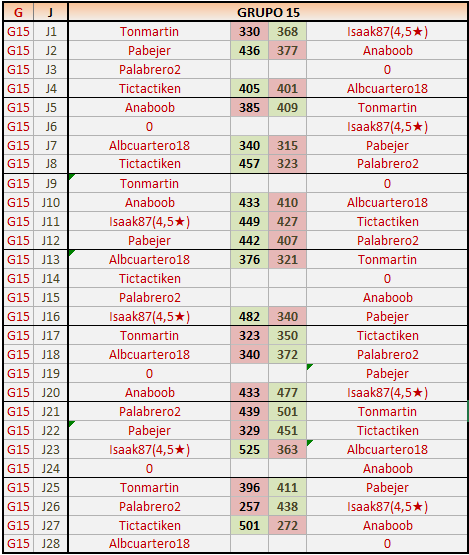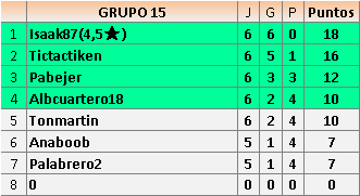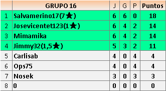 Deja un comentarioEn está página se irán publicando los resultados de las diferentes partidas, siendo ambos jugadores responsables de subirlos o de comprobar que ya hayan sido publicados insertando un COMENTARIO en la parte inferior de la pantalla (opción “Deja tu comentario”), indicando el nombre de los dos jugadores y los puntos obtenidos en la partida.