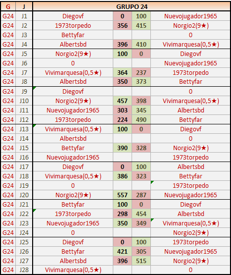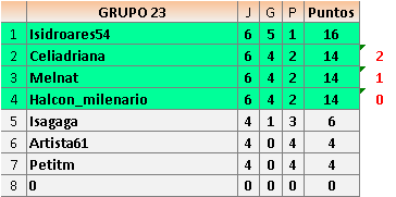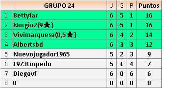Deja un comentarioEn está página se irán publicando los resultados de las diferentes partidas, siendo ambos jugadores responsables de subirlos o de comprobar que ya hayan sido publicados insertando un COMENTARIO en la parte inferior de la pantalla (opción “Deja tu comentario”), indicando el nombre de los dos jugadores y los puntos obtenidos en la partida.