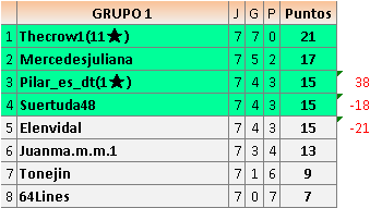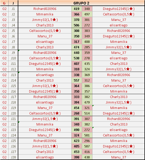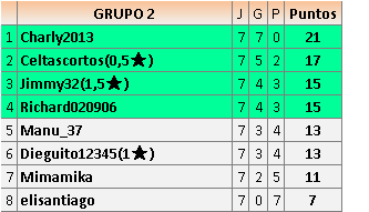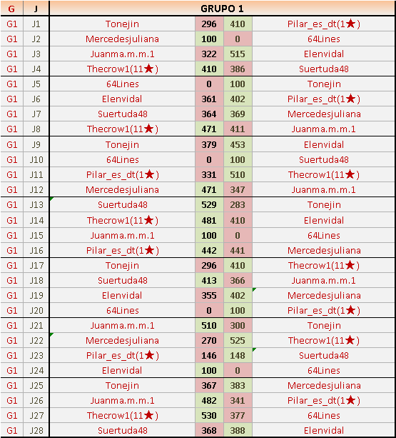 Deja un comentarioEn está página se irán publicando los resultados de las diferentes partidas, siendo ambos jugadores responsables de subirlos o de comprobar que ya hayan sido publicados insertando un COMENTARIO en la parte inferior de la pantalla (opción “Deja tu comentario”), indicando el nombre de los dos jugadores y los puntos obtenidos en la partida.