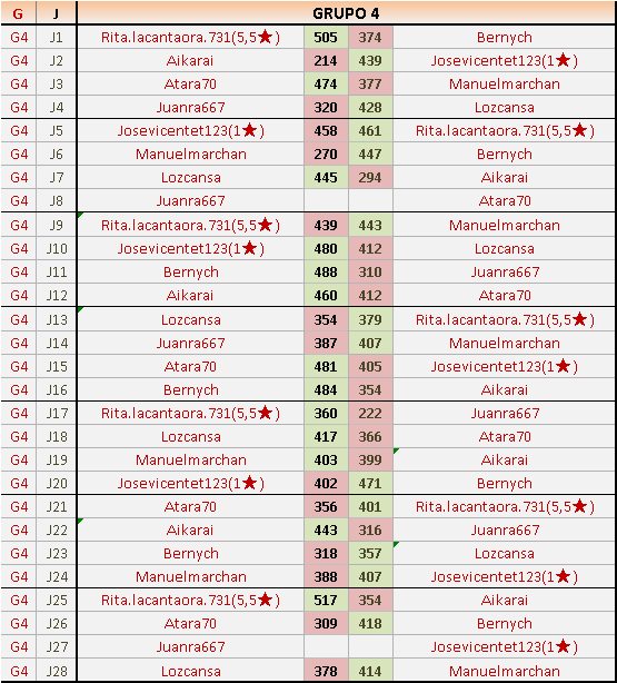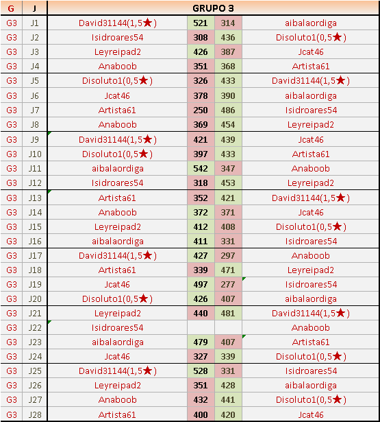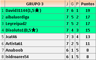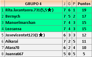 Deja un comentarioEn está página se irán publicando los resultados de las diferentes partidas, siendo ambos jugadores responsables de subirlos o de comprobar que ya hayan sido publicados insertando un COMENTARIO en la parte inferior de la pantalla (opción “Deja tu comentario”), indicando el nombre de los dos jugadores y los puntos obtenidos en la partida.