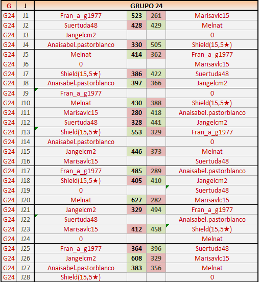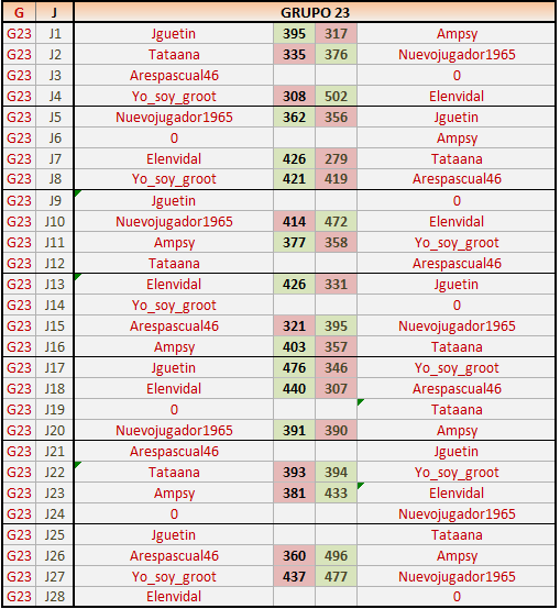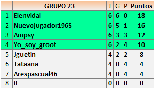 Deja un comentarioEn está página se irán publicando los resultados de las diferentes partidas, siendo ambos jugadores responsables de subirlos o de comprobar que ya hayan sido publicados insertando un COMENTARIO en la parte inferior de la pantalla (opción “Deja tu comentario”), indicando el nombre de los dos jugadores y los puntos obtenidos en la partida.