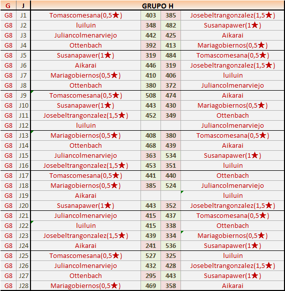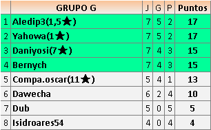 Deja un comentarioEn está página se irán publicando los resultados de las diferentes partidas, siendo ambos jugadores responsables de subirlos o de comprobar que ya hayan sido publicados insertando un COMENTARIO en la parte inferior de la pantalla (opción “Deja tu comentario”), indicando el nombre de los dos jugadores y los puntos obtenidos en la partida.