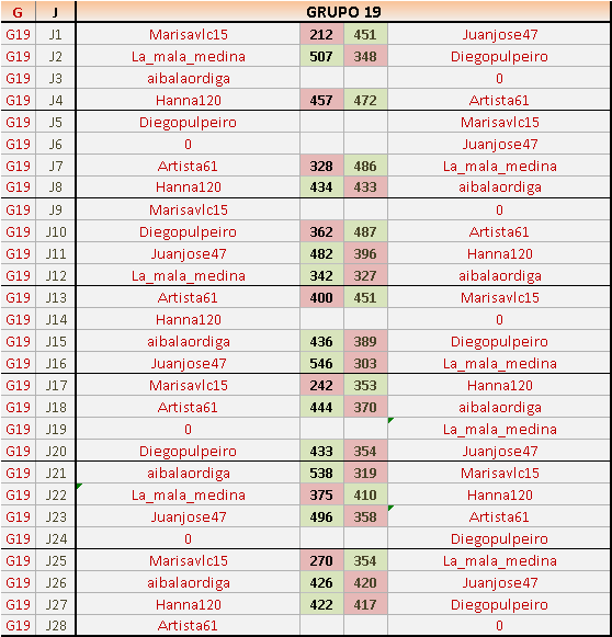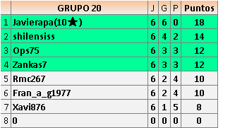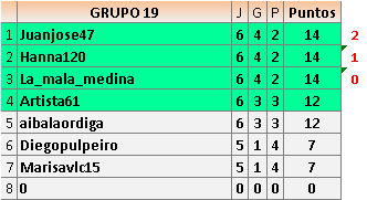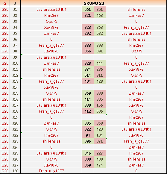 Deja un comentarioEn está página se irán publicando los resultados de las diferentes partidas, siendo ambos jugadores responsables de subirlos o de comprobar que ya hayan sido publicados insertando un COMENTARIO en la parte inferior de la pantalla (opción “Deja tu comentario”), indicando el nombre de los dos jugadores y los puntos obtenidos en la partida.