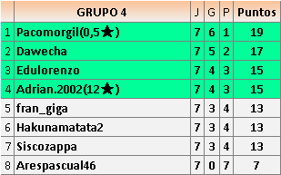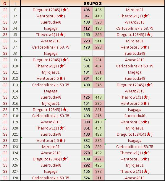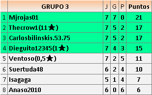 Deja un comentarioEn está página se irán publicando los resultados de las diferentes partidas, siendo ambos jugadores responsables de subirlos o de comprobar que ya hayan sido publicados insertando un COMENTARIO en la parte inferior de la pantalla (opción “Deja tu comentario”), indicando el nombre de los dos jugadores y los puntos obtenidos en la partida.