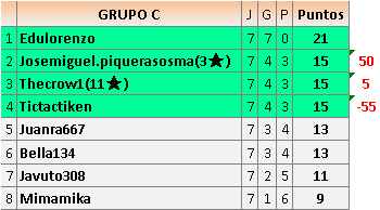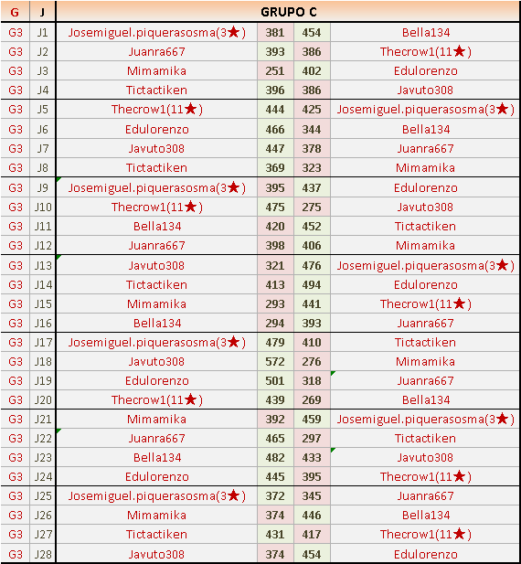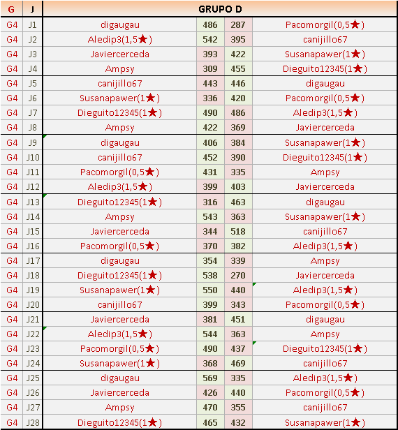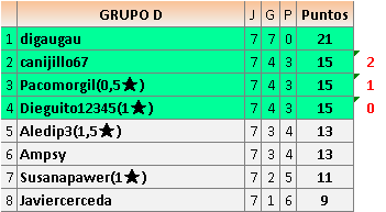 Deja un comentarioEn está página se irán publicando los resultados de las diferentes partidas, siendo ambos jugadores responsables de subirlos o de comprobar que ya hayan sido publicados insertando un COMENTARIO en la parte inferior de la pantalla (opción “Deja tu comentario”), indicando el nombre de los dos jugadores y los puntos obtenidos en la partida.