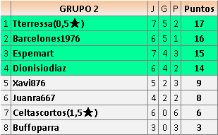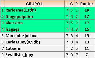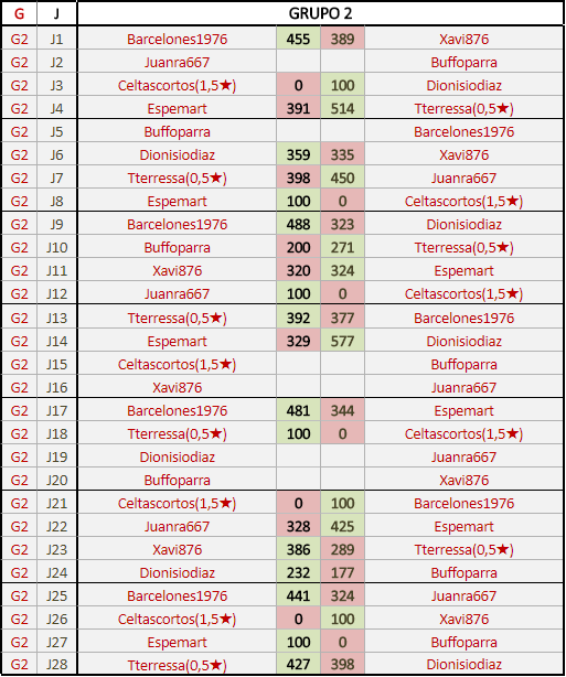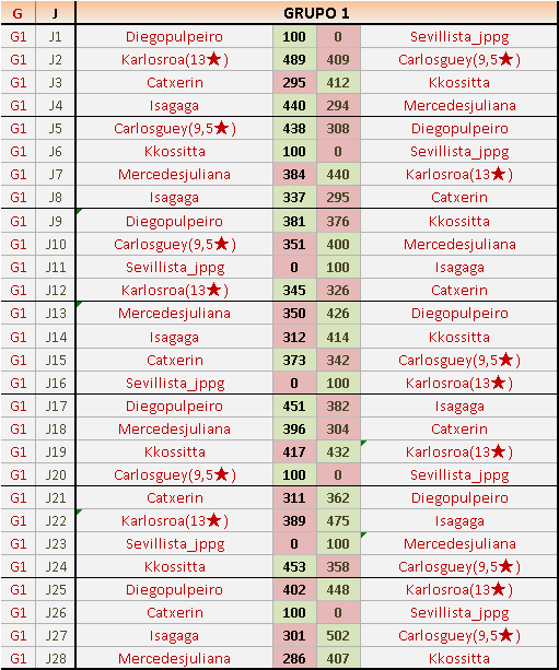 Deja un comentarioEn está página se irán publicando los resultados de las diferentes partidas, siendo ambos jugadores responsables de subirlos o de comprobar que ya hayan sido publicados insertando un COMENTARIO en la parte inferior de la pantalla (opción “Deja tu comentario”), indicando el nombre de los dos jugadores y los puntos obtenidos en la partida.