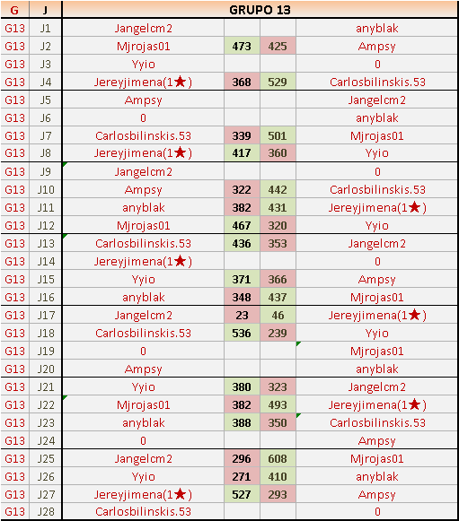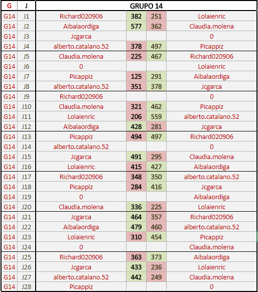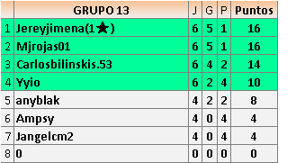 Deja un comentarioEn está página se irán publicando los resultados de las diferentes partidas, siendo ambos jugadores responsables de subirlos o de comprobar que ya hayan sido publicados insertando un COMENTARIO en la parte inferior de la pantalla (opción “Deja tu comentario”), indicando el nombre de los dos jugadores y los puntos obtenidos en la partida.