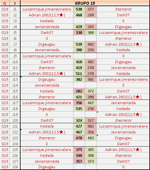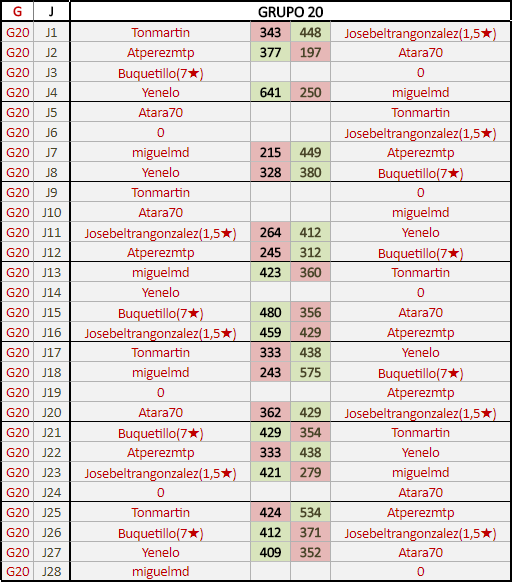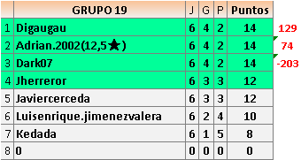 Deja un comentarioEn está página se irán publicando los resultados de las diferentes partidas, siendo ambos jugadores responsables de subirlos o de comprobar que ya hayan sido publicados insertando un COMENTARIO en la parte inferior de la pantalla (opción “Deja tu comentario”), indicando el nombre de los dos jugadores y los puntos obtenidos en la partida.