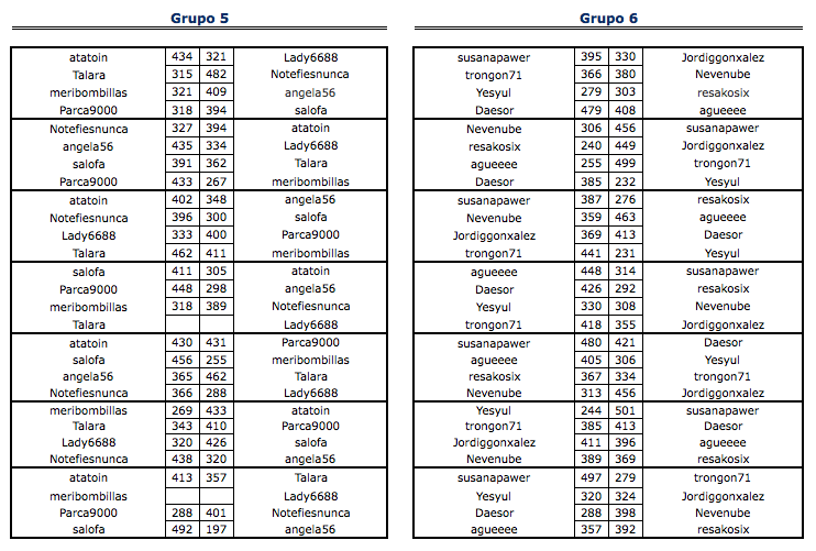 En está página se irán indicando los resultados de las diferentes partidas. Lo único que tienes que hacer es insertar un comentario en la parte inferior de la pantalla (“Deja tu comentario”) indicando el nombre de los dos usuarios y los puntos obtenidos por ambos en la partida. El vencedor de cada partida será el encargado de comunicar el resultado en este apartado.