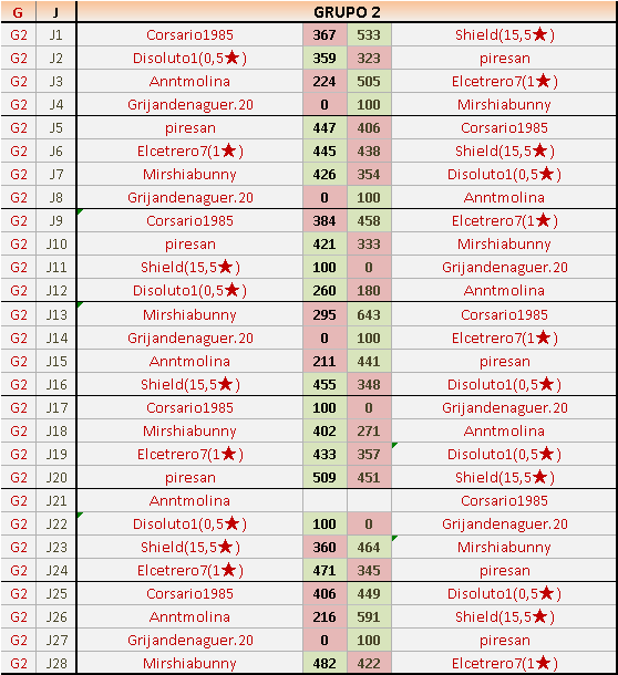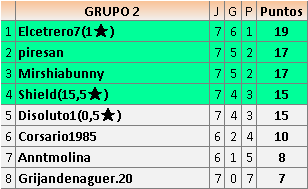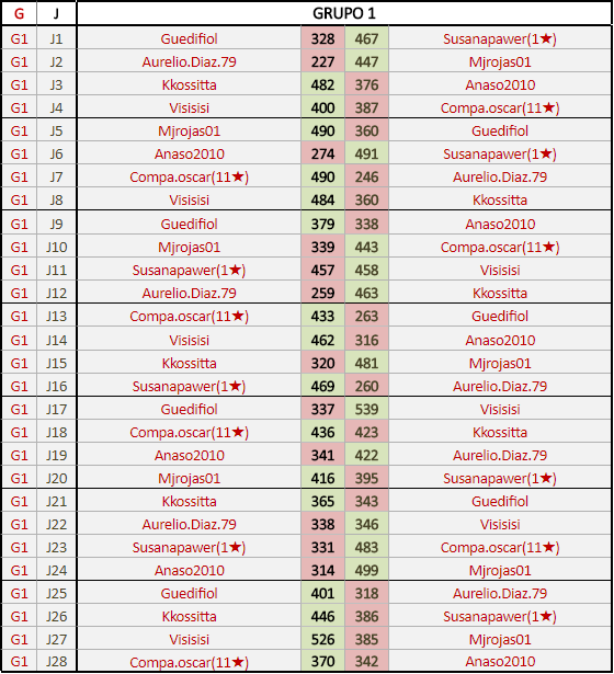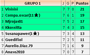 Deja un comentarioEn está página se irán publicando los resultados de las diferentes partidas, siendo ambos jugadores responsables de subirlos o de comprobar que ya hayan sido publicados insertando un COMENTARIO en la parte inferior de la pantalla (opción “Deja tu comentario”), indicando el nombre de los dos jugadores y los puntos obtenidos en la partida.