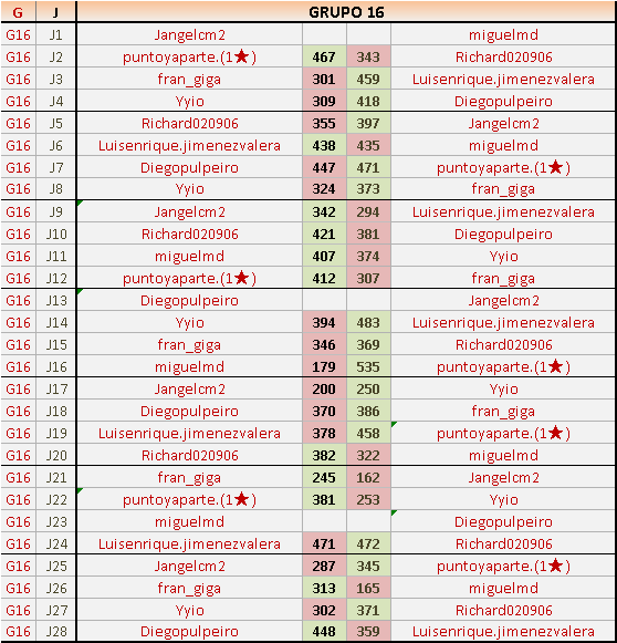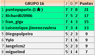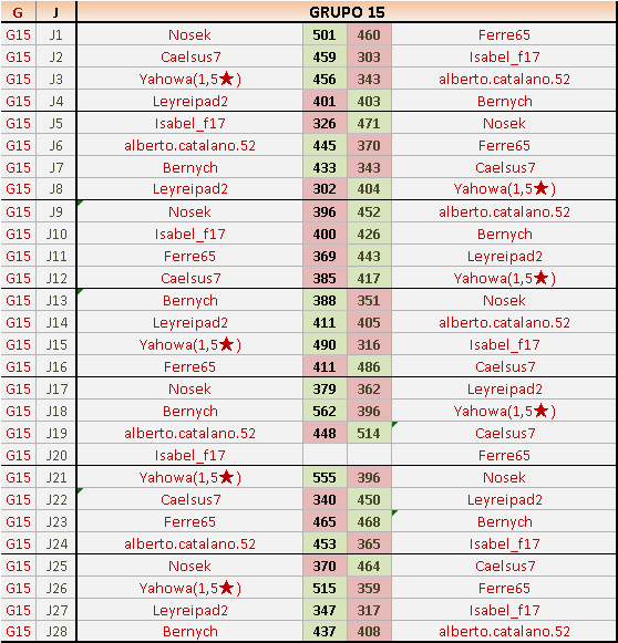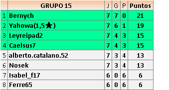 Por favor, revisad las puntuaciones, porque en el Grupo 15, J11, hay un error, ya que yo le gané a Ferre65, y así lo informé en el momento oportuno.