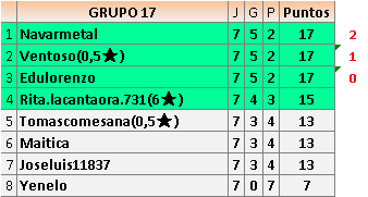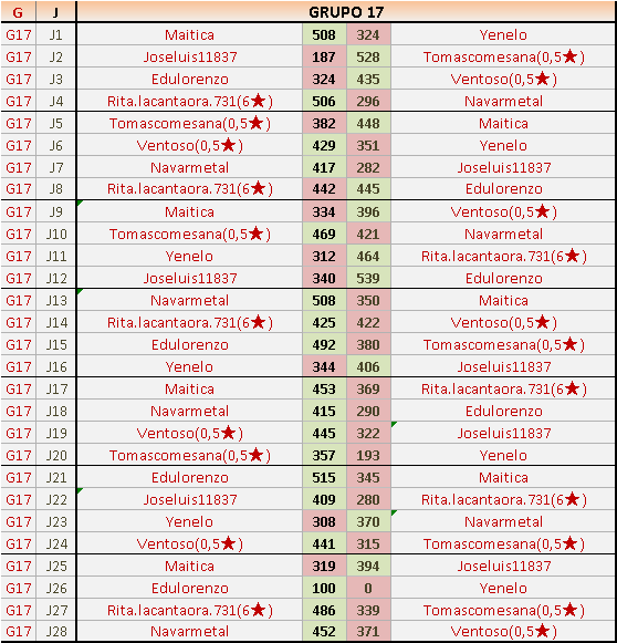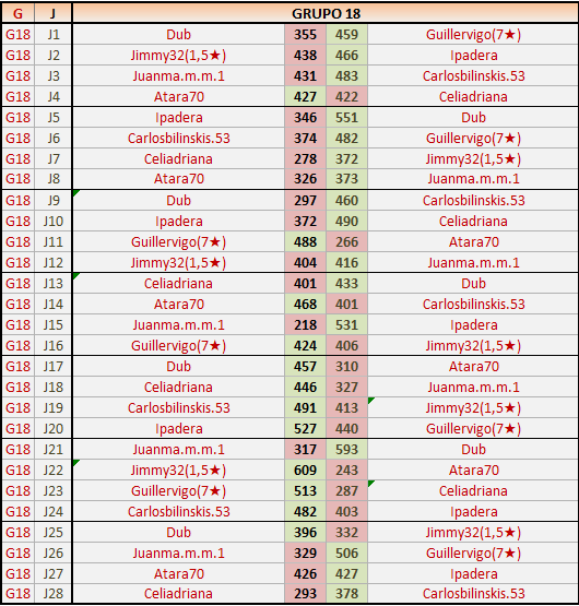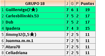 Deja un comentarioEn está página se irán publicando los resultados de las diferentes partidas, siendo ambos jugadores responsables de subirlos o de comprobar que ya hayan sido publicados insertando un COMENTARIO en la parte inferior de la pantalla (opción “Deja tu comentario”), indicando el nombre de los dos jugadores y los puntos obtenidos en la partida.