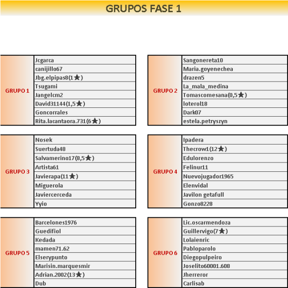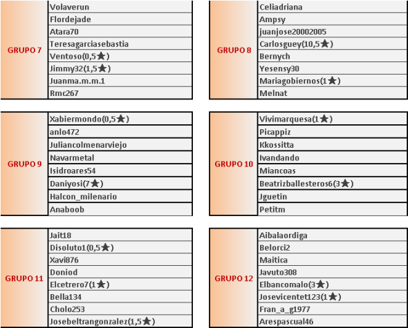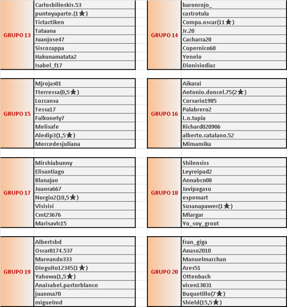 Buenos días, me he fijado y al parecer estoy inscrito en éste torneo en 2 grupos, uno en el grupo 7 y en el grupo 19, ha debido pasar algún error. Ya me diréis que hago y en qué grupo juego. Gracias.